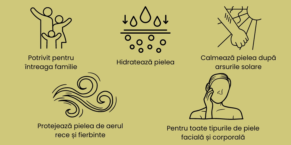 - Calmează iritațiile pielii cauzate de expunerea la soare;