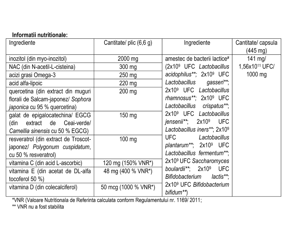 - plic: acizi grasi Omega-3; myo-inozitol; aroma naturala de lamaie, aroma naturala de zmeura, suc natural de coacaze, inulina, agent de ingrosare (maltodextrina), N-acetil-L-cisteina/NAC; extract din frunze de Ceai-verde (Camellia sinensis), continand 50 % galat de epigalocatechina/ EGCG; suc de lamaie; acid alfa-lipoic; extract din muguri florali de Salcam-japonez (Sophora japonica), continand 95 % quercetina; extract din radacini de Troscot-japonez (Polygonum cuspidatum), continand 50 % resveratrol; acid L-ascorbic; acetat de DL-alfa tocoferol, furnizand 50 % vitamina E; indulcitor (sucraloza); agent antiaglomerant (dioxid de siliciu); colecalciferol