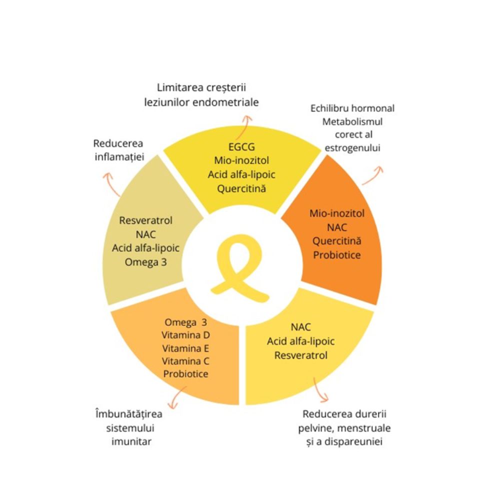 Endoprofem® este un supliment alimentar de ultimă generație, creat pentru a sprijini sănătatea femeilor afectate de endometrioză, adenomioză și alte afecțiuni inflamatorii uro-genitale. Combinând ingrediente antiinflamatorii naturale atent selecționate (plic) și bacterii probiotice benefice (capsule), Endoprofem acționează în 2 pași distincți la reglarea răspunsului hormonal și imunitar precum și la menținerea sănătoasă a florei intestinale și intime (uter, endometru, vagin, col uterin,trompe).