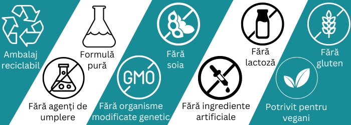 - Formula pură, fără agenți de umplere, fără ingrediente artificiale, fără organisme modificate genetic, fără gluten, fără lactoză, fără soia