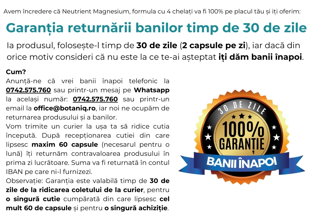 Neutrient Magnesium asigură 244 mg de magneziu cu acțiune rapidă și foarte absorbabil, o cantitate ideală pentru a completa aportul alimentar fără a depăși limitele de siguranță extrem de importante.