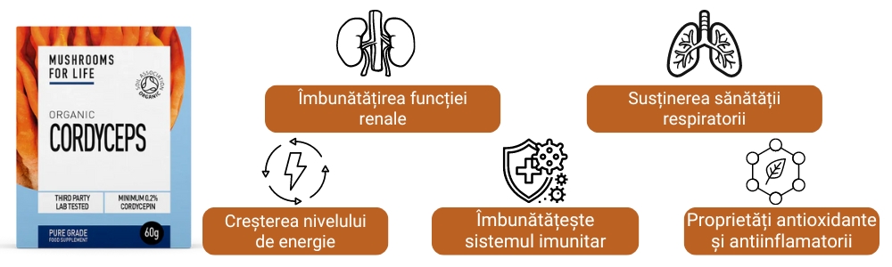 Procesăm cu grijă Cordycepsul utilizând specia superioară Cordyceps militaris. Produsul MushroomsForLife conține o combinație de biomasă organică de Cordyceps (Cordyceps Militaris) și extract din corpul fructifer al Cordycepsului organic. Tehnica noastră de extracție cu apă caldă maximizează biodisponibilitatea beta-glucanilor benefici, asigurând un nivel superior de absorbție. Gama noastră de capsule oferă o modalitate convenabilă pentru a furniza doze precise și terapeutice din acești compuși valoroși.