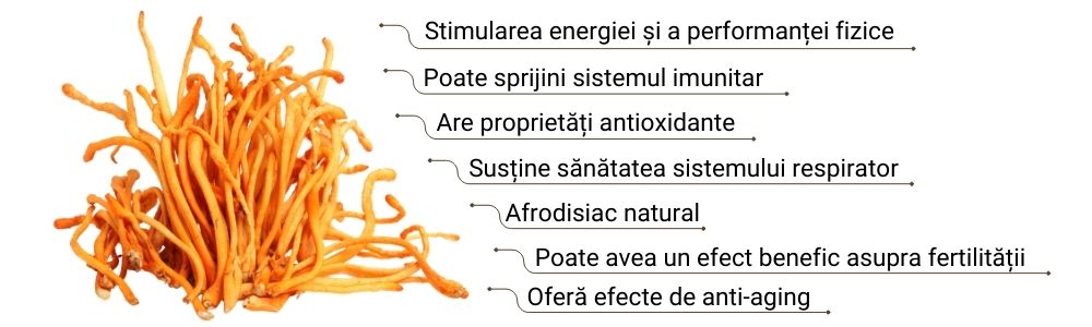 Cercetările au demonstrat că ciuperca Cordyceps poate stimula producția de celule imune protectoare și poate îmbunătăți răspunsul imun. De asemenea, are efecte antivirale puternice, în special specia militaris, care este bogată în cordicepin.
