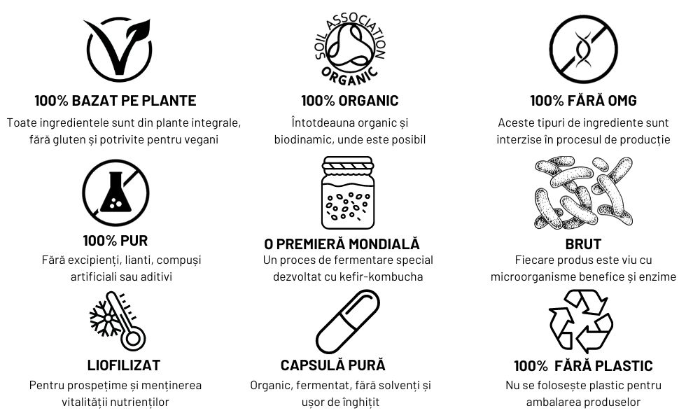 Fermentarea are loc pe o perioadă de 30 de zile, pe cultura de kefir și kombucha, este supravegheată pe toată perioada, iar ulterior se aplică un proces de liofilizare blândă pentru a obține o pulbere fină, 100% naturală, fără niciun alt ingredient sau conservant. Nu degeaba s-au proclamat “THE FERMENTATION ALCHEMISTS”