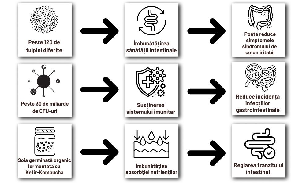 Procesul de fermentare complex și atent controlat asigură prezența unei diversități mari de microorganisme benefice, inclusiv peste 120 de tulpini diferite și mai mult de 30 de miliarde de unități formatoare de colonii (CFU-uri) pe porție. Rezultatul este un simbiotic puternic și natural care nu doar susține sănătatea digestivă, dar și echilibrează și întărește microbiomul intestinal.