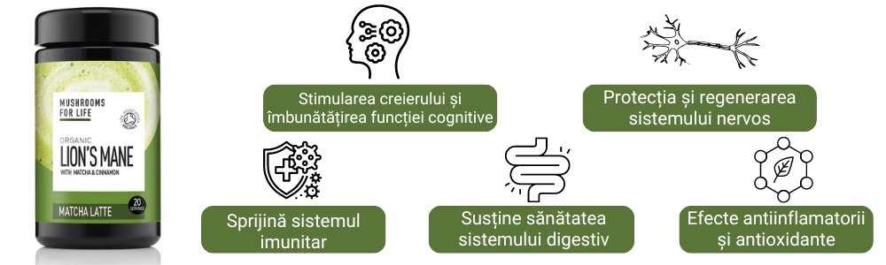 - Fiecare porție de Matcha Latte conține 1000 mg de ciupercă Lion's Mane, care este recunoscută pentru susținerea cognitivă și protejarea funcției nervoase.