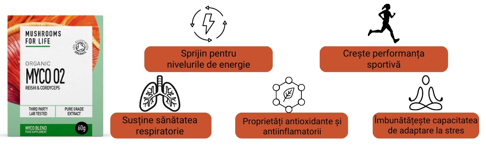 Ingrediente/doză zilnică**: pulbere din extract hidroetanolic (apă fierbinte) 15:1 din corpul fructifer al ciupercii Reishi (Ganoderma lucidum)*, conținând minimum 25 % polizaharide, minimum 20 % beta-glucani și minimum 4 % triterpene – 500 mg; pulbere din biomasă de Cordyceps (Cordyceps sinensis)*, conținând minimum 50 % polizaharide, minimum 15 % 1,3-1,6 beta-glucani și maximum 5 % alfa-glucan – 500 mg (*ingredient organic; **doza zilnică recomandată conține minimum 15 % beta-glucani)