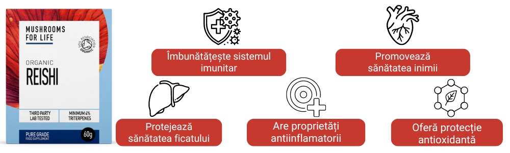 Ganoderma/Reishi poate oferi sprijin în apărarea imunologică, sprijină menținerea funcției circulatorii sănătoase, poate ajuta la controlul colesterolului.