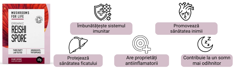 Ganoderma/Reishi poate oferi sprijin în apărarea imunologică, sprijină menținerea funcției circulatorii sănătoase, poate ajuta la controlul colesterolului.