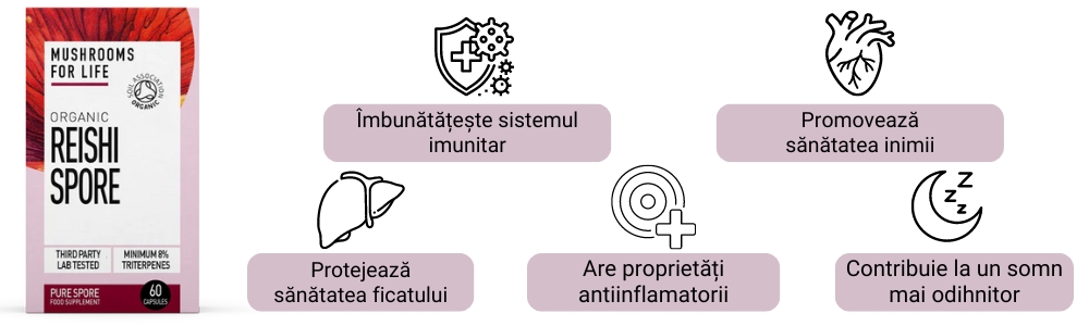 Ciupercile Reishi sunt cunoscute pentru capacitatea lor de a îmbunătăți sistemul imunitar. Conțin beta-glucani, un tip de polizaharidă care activează celulele albe din sânge, sporindu-le eficiența în combaterea bolilor și întărindu-le apărarea naturală.
