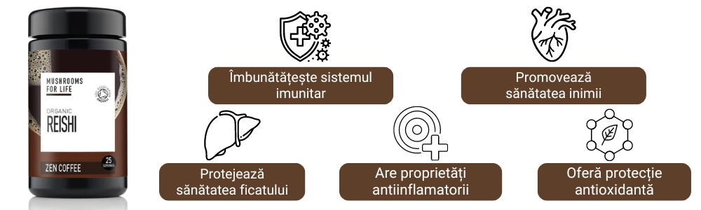 Proprietățile stimulante ale cafelei sunt echilibrate de compușii activi din Reishi, oferind o experiență de consum mai relaxantă și mai benefică pentru organism.