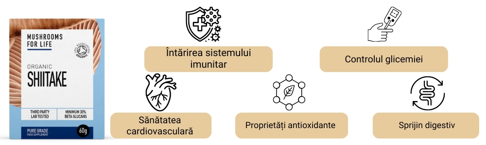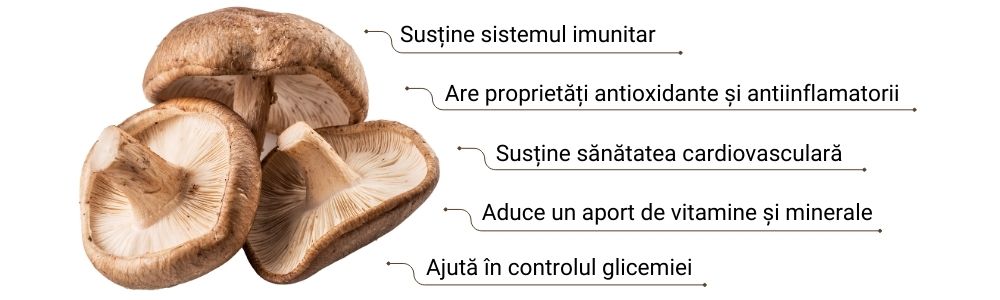 Pe lângă beneficiile pentru sistemul imunitar și aportul de nutrienți, skiitake are și potențialul de a susține sănătatea cardiovasculară prin reducerea nivelului de colesterol și îmbunătățirea circulației sângelui.