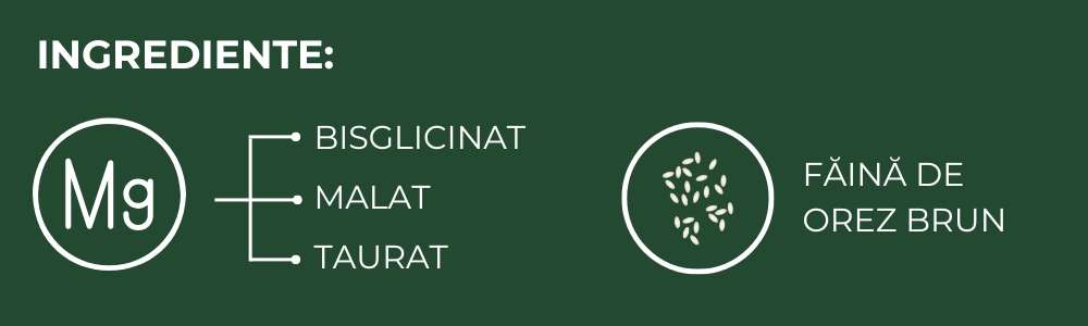 Ingrediente: magneziu bisglicinat, magneziu malat, magneziu taurat, făină de orez brun.