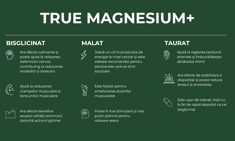Formulat cu trei forme de magneziu biodisponibil - magneziu bisglicinat, magneziu malat și magneziu taurat – True Magnesium+ este gândit să furnizeze un spectru larg de beneficii datorită fiecărei forme de magneziu, fiecare cu proprietăți distincte care contribuie la susținerea sănătății generale.