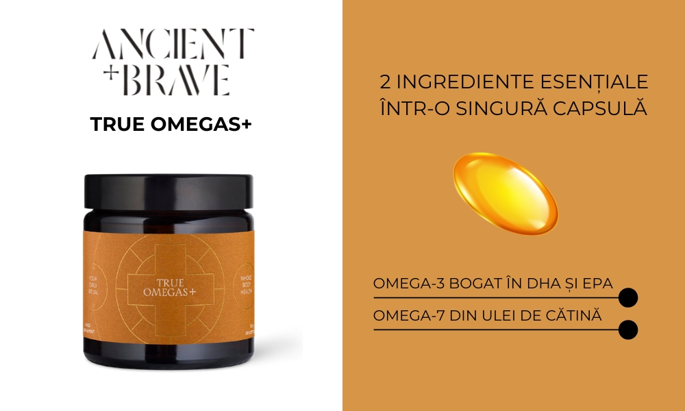 True Omegas+ de la Ancient and Brave, aduce soluția perfectă — o formulă inteligentă și modernă care combină omega-3 pur din alge și omega-7 din cătină, pentru a sprijini sănătatea corpului și a minții. Inspirat din nevoile fundamentale ale organismului, acest supliment redă corpului tău o doză optimă de grăsimi bune, cu beneficii reale.