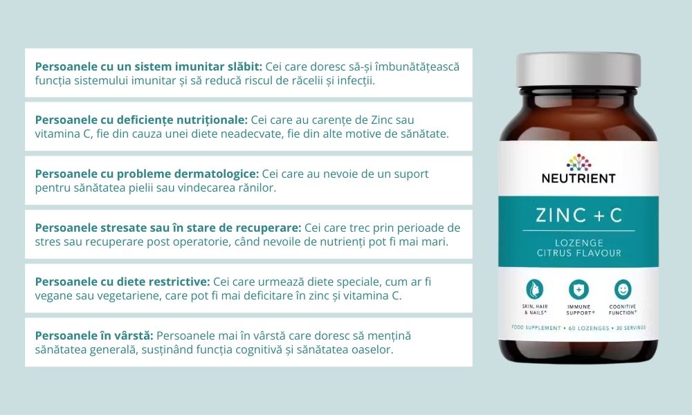 Zincul + Vitamina C de la Neutrient este un supliment potrivit pentru diverse persoane care au nevoie de un sprijin suplimentar pentru sănătate, inclusiv: